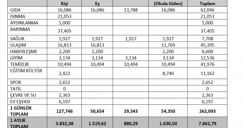 Türkiye İstatistik Kurumu’ndan alınan Aralık 2020 fiyatlarına göre yapılan araştırmada çalışan tek kişinin yoksulluk sınırı 3.832,38 TL olarak hesaplandı. Dört kişilik bir ailenin asgari geçim haddi ise 7.862,79 lira olarak belirlendi.