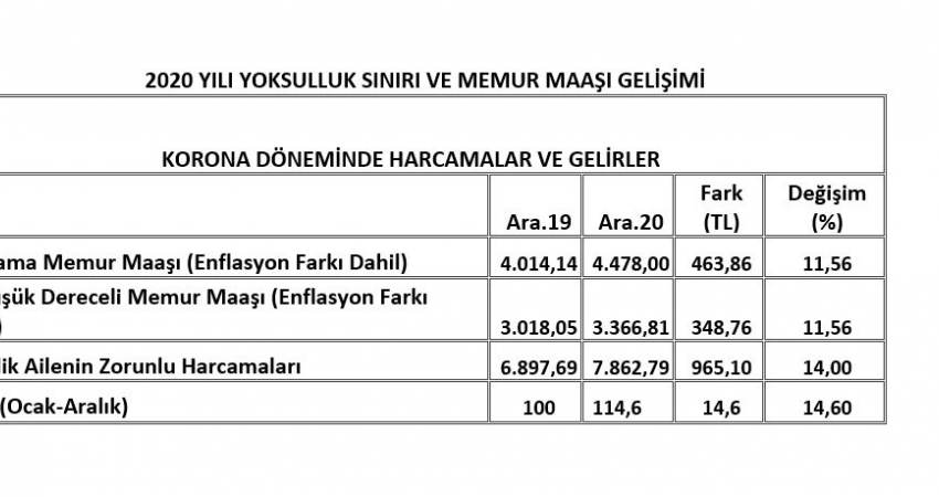 Aralık 2020 itibari ile ortalama 4.478,00 TL ücret alan bir memurun ailesi için yaptığı gıda harcaması, maaşının A,57’sini oluşturuyor.